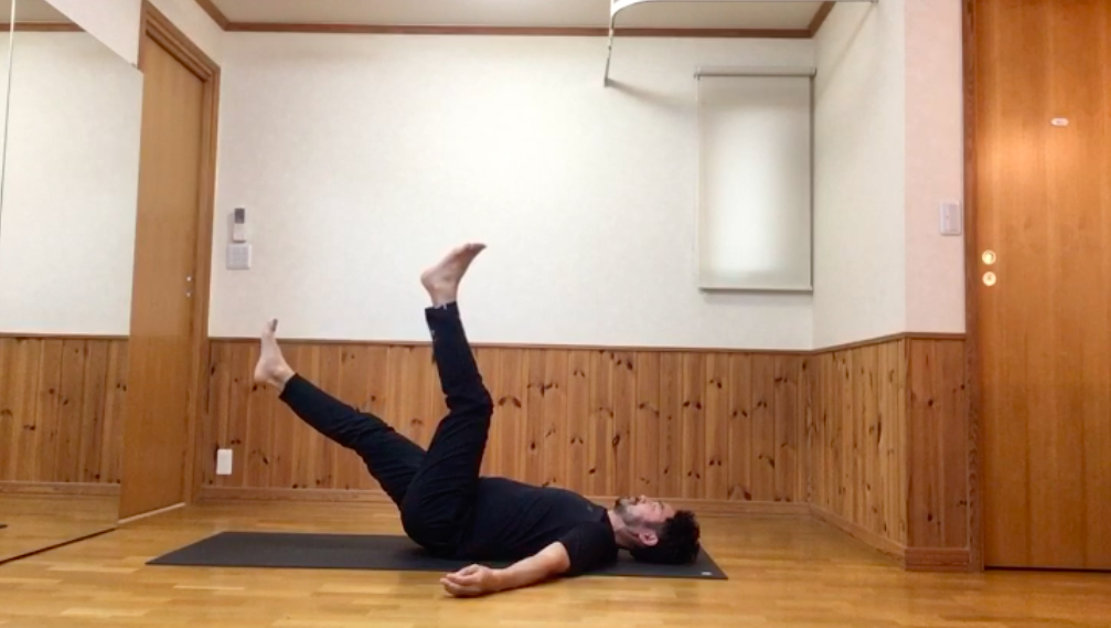 両足を上げて腹圧をキープしたまま、片足を45度くらい下げて戻す。